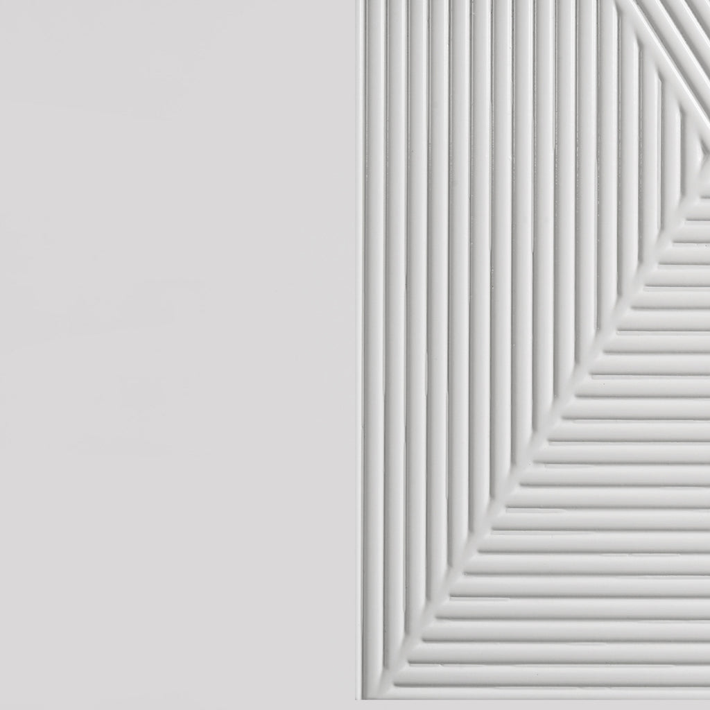 With a sleek high gloss finish and sculptural texture, this five-drawer chest makes a striking addition to the modern bedroom. Its geometric drawer fronts feature ribbed V-patterns that shift across each tier, accented by polished chrome U-shaped pulls. The top drawer is lined in black felt for delicate storage, while all drawers operate smoothly on 45mm metal extension glides. Elevated on tapered chrome-finished legs, this chest offers elevated storage with sharp visual impact. Key Features: • Five-drawer chest in white high gloss finish with sculptural ribbed geometric drawer fronts • Top drawer is fully lined in black felt to protect jewelry and delicate items • 45mm metal extension drawer glides ensure smooth and consistent drawer performance • Polished chrome U-shaped pulls add sleek contrast to textured sculptural surfaces • Tall vertical form provides generous storage in a modern, compact footprint • Crafted from engineered wood for style, structure, and longevity