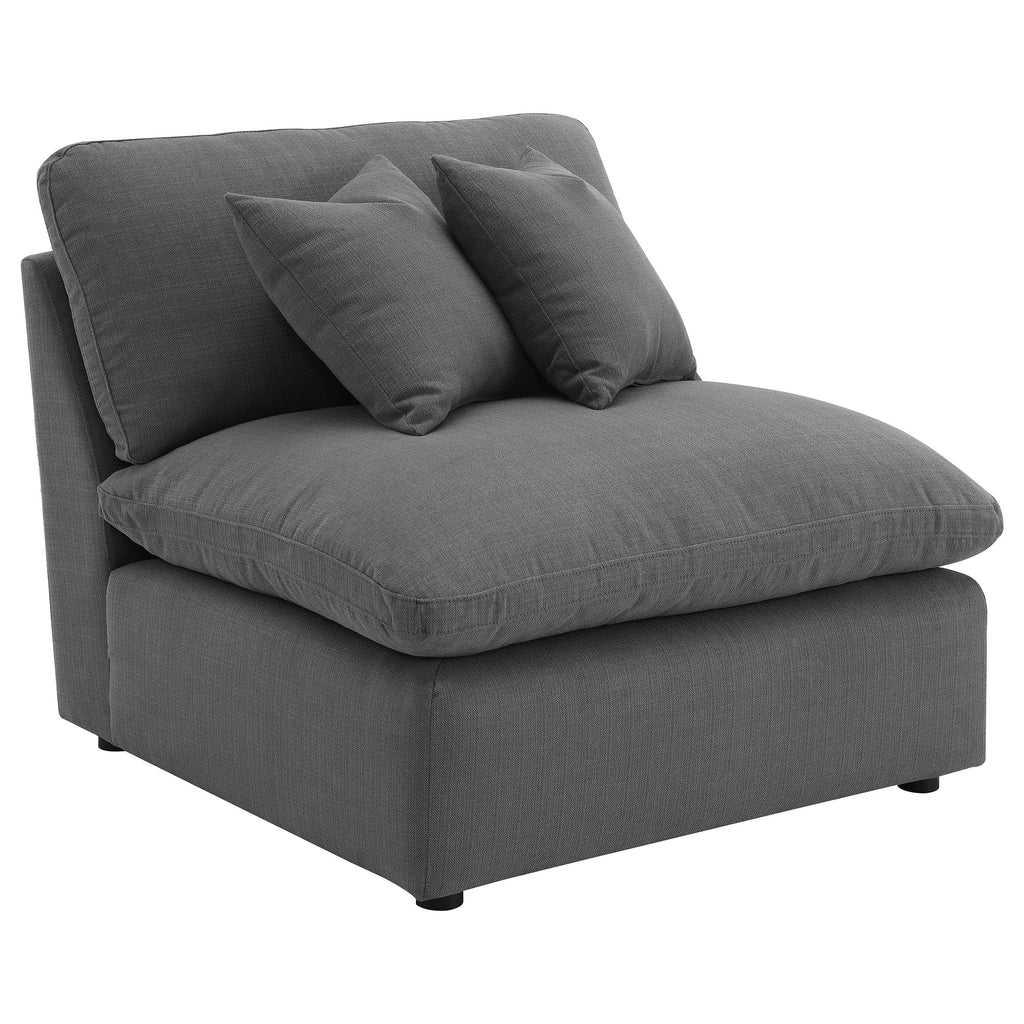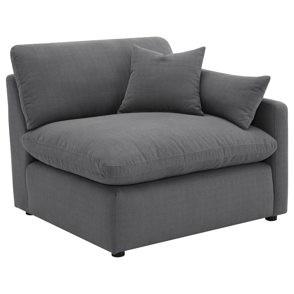 This modular sectional sofa blends modern style with luxurious comfort. Upholstered in soft performance fabric, it features feather blend-wrapped box cushions with reversible seating and backs for lasting support. Tailored topstitching and slim track arms create a sleek contemporary look, while plush accent pillows enhance comfort. Treated fabric resists moisture, allowing for easier maintenance and everyday durability. Designed for lounging, this sectional offers both elegance and versatility. Key Features: • Six-piece sectional in ivory fabric with slim track arms and tailored topstitching • Reversible seat and back cushions with feather blend filling provide soft comfort • Moisture-repellent treated fabric simplifies cleaning and everyday maintenance • Ottoman with plush cushion functions as footrest, coffee table, or extra seating • Accent pillows included to enhance comfort and complete the sectional design • Durable frame construction ensures strength and long-lasting living room use