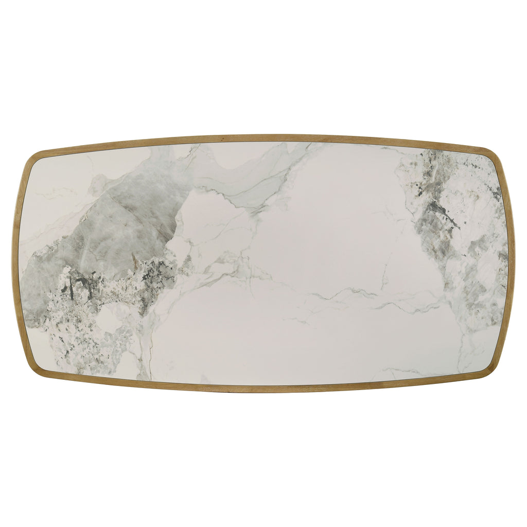 This mid-century dining set combines sculptural elegance with practical performance. The fixed-top table features a recessed ceramic surface with marble-like tones framed in solid wood, offering an impermeable, heat-resistant, and easy-to-clean finish. Slatted angular legs add architectural flair. The side chairs provide plush grey upholstery, curved backrests for support, and gently rounded frames. Crafted for comfort and durability, this set seats six with effortless style. Key Features: • Dining set with recessed ceramic tabletop and grey upholstered curved-back side chairs • Tabletop features marble-look tones and is heat resistant, stain resistant, and easy to clean • Solid wood frame and softly curved edges add durability and vintage-inspired charm • Slatted angular legs bring mid-century character with a sculptural foundation • Chairs feature plush grey fabric and rounded posts for comfort and subtle detail • Crafted from solid rubberwood, ceramic composite, engineered wood, fabric, and foam