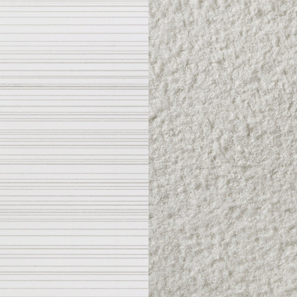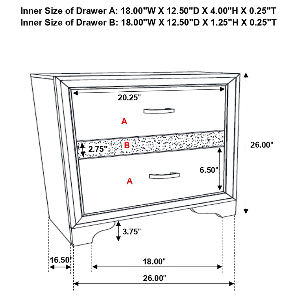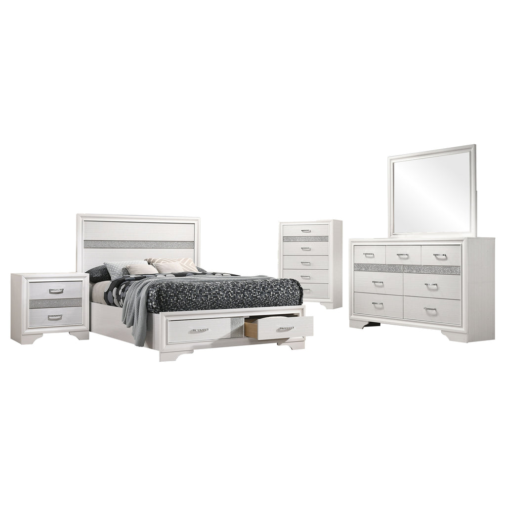 Sparkling diamond-like trim ups the glamour for a five-piece modern bedroom set. Compelling in its elegant simplicity, it centers on an upholstered bed and features a lightly textured white finish paired with smooth white molded trim. A nightstand, dresser with mirror, and chest provide plenty of drawers for easy storage and organization. Stripes of glittering, diamond-like trim and jewel-like bar pulls elevate the set, creating a fresh, sophisticated look and feel for your bedroom. Bracket feet complete the look with a touch of movement.