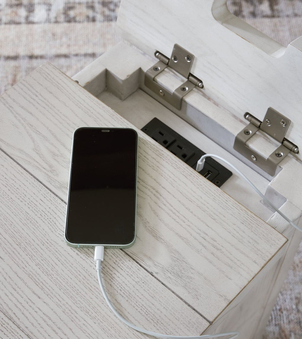 This chairside end table is sure to impress with its timeless traditional vibe. Thanks to the antiqued white finish and wood grain texture, modern farmhouse design has never been so fashionable. The smooth-gliding drawer and storage behind the door are ideal for stowing items out of sight. And did we mention that the back section of the top lifts up to reveal USB charging and a power supply? This versatile piece makes it so easy to work or play from the comfort of your sofa.