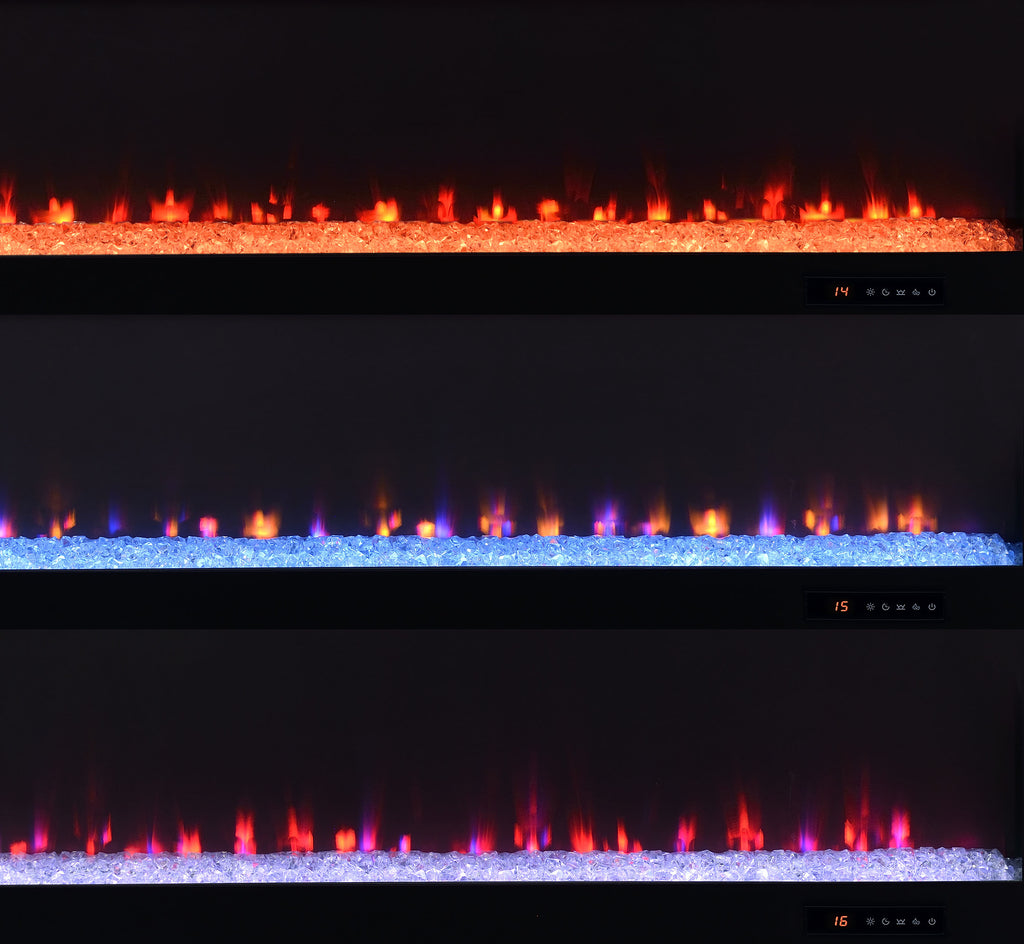 This sleek fireplace media console brings warmth and streamlined storage to contemporary living spaces. A wide electric firebox glows over crushed acrylic crystals, offering fifteen customizable flame colors operated by a wireless remote. Open side compartments with adjustable shelves store devices or décor, while rear cable management cutouts keep wires out of sight. Finished in classic black and crafted from engineered wood with a laminate veneer, it serves as a refined TV stand or entertainment center. Please note that this console does not include a heat function. Key Features: • TV stand fireplace console with flame visualizer and crushed acrylic crystals for visual warmth • Black finish highlights clean lines and adds bold, modern character to any space • Two open side compartments with adjustable shelves offer flexible display or storage • Fifteen flame colors with wireless remote control for lighting customization • Crafted from engineered wood and durable, scratch-resistant laminate veneer • Accommodates TVs up to eighty-five inches with rear cutouts for cable management