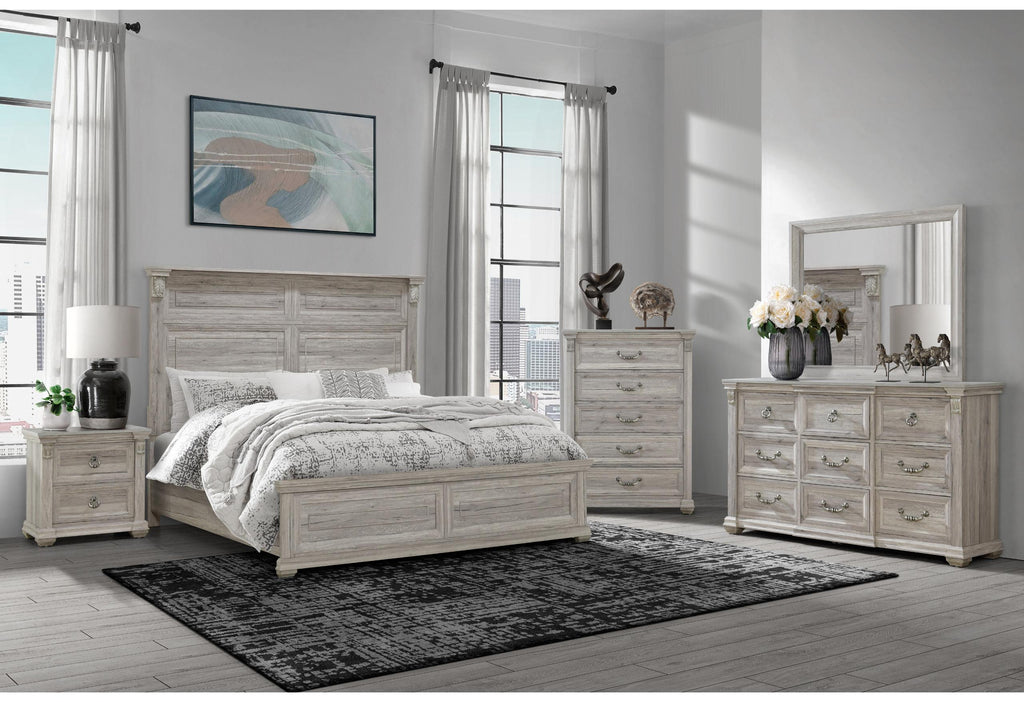 The Tatum Bedroom Collection is crafted with a rustic wood finish available in natural or grey, this classic collection boasts intricate trim, rustic drawer hardware, and elegant scroll work on every piece. The large panel headboard on the bed adds a grand touch to your bedroom.